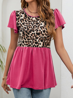 Leopard Round Neck Flutter Sleeve Babydoll Blouse